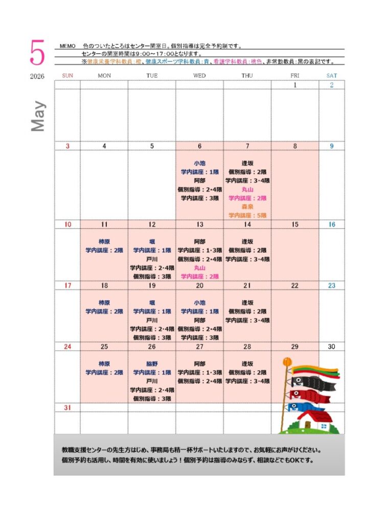 2026年5月のカレンダーはこちら↓ 【教職支援センター】5月カレンダー 5月1日(金)~5日(火)は大学休業日です。教職支援センターも閉室いたします。 教員採用試験に向けて、限られた時間を有効に使い …